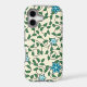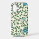 Seamless floral pattern with blue flowers, green leaves, and twisting vines on a light beige background. The design is lively and decorative.