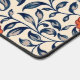Seamless floral pattern with vibrant orange flowers and navy blue leaves on a beige background, creating an ornate, symmetrical design.