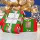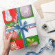A seamless pattern with illustrations showing images with a Christmas theme. The images are of wrapped gifts, snowmen, and Christmas bears. The pattern has nine sections with alternate red and green backgrounds and a white one in the centre. The centre panel has the words Merry Christmas written in red on it.