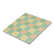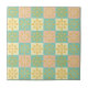 A seamless pattern with geometric floral motifs in yellow, pink, and teal on pastel squares, creating a vintage, harmonious, and cheerful design.