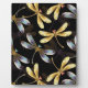 Seamless pattern with gold, jewellery, shiny dragonflies with detailed, sparkling wings on black background. Gold dragonfly.