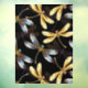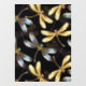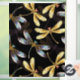 Seamless pattern with gold, jewellery, shiny dragonflies with detailed, sparkling wings on black background. Gold dragonfly.