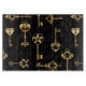 Seamless pattern of antique, gold and silhouette keys on black background.