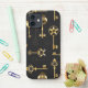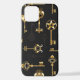 Seamless pattern of antique, gold and silhouette keys on black background.