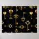 Seamless pattern of antique, gold and silhouette keys on black background.