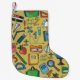 Seamless pattern with school supplies on a yellow small christmas stocking