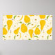 Seamless pear pattern. Different pears whole fruits and pieces with leaves on light yellow background