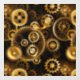 Seamless, metal, brass, gold gears on rusty dark background. Steampunk style.
