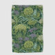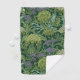 Seamless William Morris style wallpaper pattern featuring dense green foliage and large, rounded flowers in shades of lime green, off-white, and muted lavender against a dark emerald background.