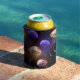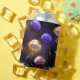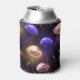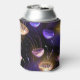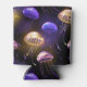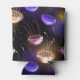 Seamless pattern of bright, golden, purple, artistically drawn, glowing jellyfish on black sea background. Glowing jellyfish.