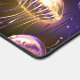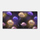 Seamless pattern of bright, golden, purple, artistically drawn, glowing jellyfish on black sea background. Glowing jellyfish.