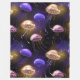 Seamless pattern of bright, golden, purple, artistically drawn, glowing jellyfish on black sea background. Glowing jellyfish.