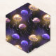 Seamless pattern of bright, golden, purple, artistically drawn, glowing jellyfish on black sea background. Glowing jellyfish.
