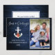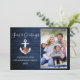Modern Calligraphy Script Nautical Seas & Greetings Photo Holiday Card. Anchor topped with Watercolor Floral including red poinsettias, pine cones and other beautiful winter greenery. Blue Wood Print.