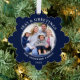 Modern Seas and Greetings Christmas Holiday Photo Ornament Card - Navy Blue Background. Anchor topped with Watercolor Floral including red poinsettias, pine cones and other beautiful winter greenery. This is a greeting card that is also an ornament.