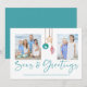 Seas and Greetings Seashell Ornament Holiday Photo Christmas Cards featuring turquoise blue and sandy tan shell ornaments hanging from sailing jute rope with elegant typography. Add two of your photos and a personal message for a fun nautical holiday card. Please contact us at cedarandstring@gmail.com if you need assistance with the design or matching products.