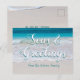 Seas and greetings postcard with ocean beach scene and tropical water. Big text on the front is easy to change to “Merry Christmas” or “Happy New Year” with a line for signature beneath. On the back, a mailing address template is provided, or the text can be removed to order cards blank. Another beach sand image is the background on the reverse.