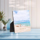 "Seas the Day" quote in beach sand. Captivating beached fishing boat on a sandy beach with watercolor aqua blue ocean,and sunny sky above.