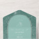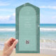 White line art illustration of palm leaves pattern over aqua background with white text and seashell design over aqua arch with tan border. Outside is pink with return address and palm leaf illustration on flap. Rsvp features qr code.