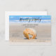A unique wedding invitation featuring a seashell that has a natural heart shape. A perfect symbol of love for the celebration of love. The shell is surrounded by sand with ocean waves in the distance creating the perfect image for the beach wedding.