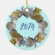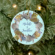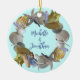 Seashell wreath name and date ornament. Round, ceramic Christmas keepsake for a couple to add their names on the front and year on back. Light blue background shows off a circle of tropical beach shells such as conchs, starfish, augers and naticas.