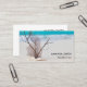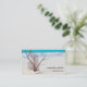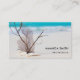 Business cards with a gorgeous photograph. Tropical blue water and foamy surf in the background. A collection of seashells and stems set on a white sandy beach.