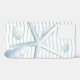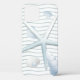 Soft bluish grey starfish, seashells, and an open oyster with a pearl....all over a background of the shadows of overlying ocean waves.