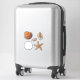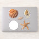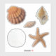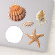 Five isolated seashell stickers. Realistic images include a lions paw scallop shell, spotted junonia, sand dollar, and brown starfish / sea star. Stickers come in many sizes, with optional white or transparent edges. Use to decorate packages, as envelope seals, or kid's party favours.