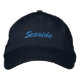 Cap shown in navy blue with blue embroidered text.