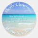 Seaside Christmas tropical address labels. Round, with curved text at the top and bottom, add name and address to the centre, over an image of tropical ocean water and beach shoreline. Customise all text, including "Merry Christmas" and "Happy New Year".