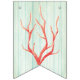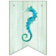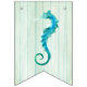 Beach wedding sea life themed bunting banner done in a sea cottage feel, with each flag having a pale aqua washed out wood look. Graphics of sea horses, coral, and shells decorate the flags with no letters. Mr. & Mrs. and bold white lettering on the middle flags, have graphics of a rope frame around each letter. Matching wedding products are available.