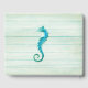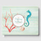 Lovely beach theme wedding guest book, done in a sea foam green washed out looking wood background. Graphics of turquoise sea horse, a scallop shell and coral decorate around the rope framed text area. Personalise the bride and groom's names, for your beach wedding. Matching products are available.