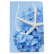Seaside Garden, floral beach themed paper gift bag. Add a custom message with names and use this pretty floral gift bag to hold shower or wedding gifts.This design looks fine on most bag sizes, but the wording may not fit correctly. It will print as you see it. Don't let your text get close to edges. The blue hydrangea and starfish image is on both sides.