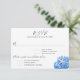 Seaside Garden menu reply cards in white with black text and a blue hydrangea with starfish design. Sample text asks guests for an exact count if they are attending. They also need to place number amounts beside each entrée listed. This helps the couple keep unexpected guests from attending and gives an accurate amount of meals needed. Modern fonts in script and printed form are used and every template is easy to customise. Reverse is light grey blue colour.