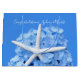 Seaside Garden, floral beach themed paper gift bag in large size. Add a custom message with names, in white script, and use this pretty floral gift bag to hold shower or wedding gifts. Don't let your text get close to edges. The blue hydrangea and starfish image is on both sides over a pretty bright blue colour.