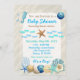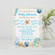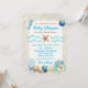 Blue, tan and teal, sandy beach themed boy's baby shower invitation. Soft colours with seahorse, seashells, fish and starfish with light sandy background make the perfect invitations for a beach themed baby shower.