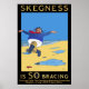 A fun 1908 vintage travel poster advertising the English seaside town of Skegness in Lincolnshire by artist John Hassall (1868-1948) for the Great Northern Railway. Later used by the London and North Eastern Railway (LNER), the poster shows a jolly fisherman skipping along a sandy beach with the pier in the background and the slogan “Skegness is SO bracing!”