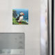 A sweet puffin magnet that has a cute illustration of a puffin sitting by the sea on an seaside dune or ledge.