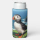 A sweet puffin can cooler that has a cute illustration of a puffin sitting by the sea on an seaside dune or ledge.