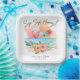 Tropical theme paper plates feature a watercolor beach sunset, cocktails, hibiscus flowers and palm leaves with a "Sip Sip Hooray" caption. You can personalise the names and details so these would work great whether you are having a wedding couple's shower, engagement party, or bridal shower (you get the idea!).