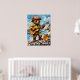 This heartwarming artwork captures a bear dressed in firefighter gear, including a helmet and sunglasses, playing an acoustic guitar while standing on a textured rock by the sea. A jar of honey with a dipper rests close by. The background features a dynamic ocean and a partly cloudy sky. The painting's thick, textured strokes add to the endearing quality of the image, with the words "Love My Honey" featured below.