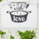 Whimsical kitchen-themed design featuring a cooking pot with the phrase **“Season everything with love”** written above and inside it. The text is playful and decorated with tiny hearts and salt shakers, creating a warm, cosy, and homely vibe.
