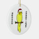 Cartoon Cockatiel ornament has a cartoon lutino wearing a red Santa hat, perched on a branch. The text reads, "Season Greetings." Perfect for parrot owners!