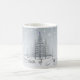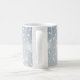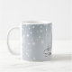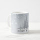 Season of Joy Winter Trees Christmas Mug - In muted silver blue colours, a stand of line art pine trees - the front tree decorated in sparkling purple stars - standing in a snow scene done in bokeh style - Season of Joy written in a hand scripted calligraphy