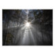 A photograph captures a breathtaking scene of a dense forest bathed in ethereal light. The sun, hidden behind a veil of fog, casts radiant beams through the trees, illuminating the misty air. The branches of the trees, silhouetted against the bright light, create a sense of depth and mystery. The overall mood is serene and tranquil, evoking a sense of peace and wonder.