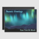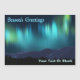 A multi-coloured, fractal rendering of the aurora borealis, or Northern Lights, superimposed on a digital painting of snow-covered mountains. Text reading "Season's Greetings" also appears in glowing blue and white. Add your own additional text.