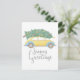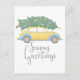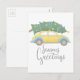 Fabulous and modern Christmas scene features VW style yellow car with a Christmas tree on the roof.