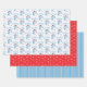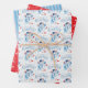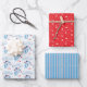 A Whimsical cute snowman in blues with red birds and presents and hand lettering of "Seasons Greetings" also in blues and red. Coordinating sheets include stripes and snowflakes with birds.