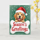 This absolutely charming Christmas card features a beautifully rendered, happy Golden Retriever puppy wearing a classic Santa hat. The cheerful dog is grinning widely, resting its paws on a large white dog bone that displays the holiday message. The text "Season's Greetings" is written on the bone in bold, festive red script. The background is a lovely, deep green with large, stylised snowflakes falling. This heartwarming card is an ideal choice for sending warm, joyful wishes from the whole family, especially from the dog!🎄🎁! Perfect for spreading holiday cheer to loved ones near and far.