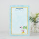Personalised stationery paper with the text: Seasons Greetings. A whimsical drawing of a pink flamingo wearing a red santa hat. Standing on a mound of yellow beach sand with a green and brown coconut palm tree in the back. Light blue background with a faint polygonal pattern. Layered over top is a semi-transparent rectangle frame with a faux gold foil border. Cute and fun festive tropical design.